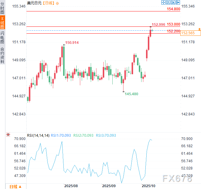 结合日内振幅指标进行分析发现,虽然美元兑日元此前已连续五个交易日上涨,一度达152.99的近八个月高点,但其日内波动幅度近三个交易日持续收窄。这或许尚不构成明确的见顶信号,但确实表明多头动能正在减弱。