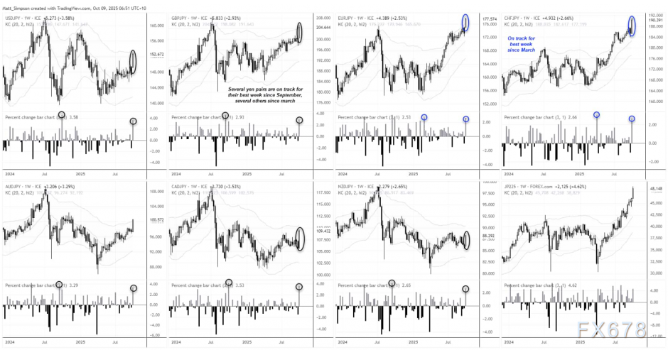盈凯外汇官网报道——本周日元已成为空头最青睐的标,因一位主张强力刺激的候选人在日本首相角逐中领先。日元交叉汇率全线飙升,美元空头回补推动美元兑日元本周累计上涨3.6%。周四(10月9日)亚市时段,美元兑日元未延续前五个交易日涨势,现于152.55附近震荡。