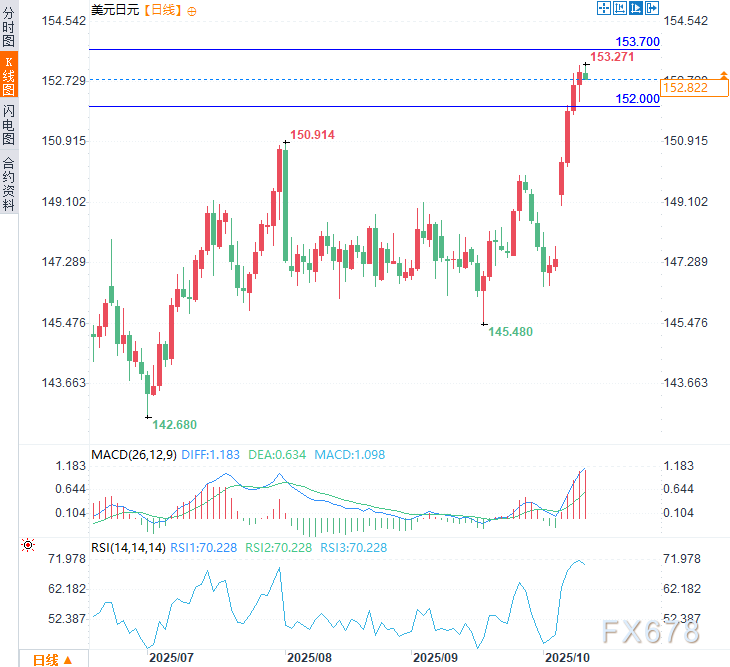 盈凯外汇官网报道——尽管美元整体走强,周五(10月10日)亚市时段,美元兑日元在触及2月13日以来新高(153.27)后略有下降,不过下行空间受限。市场人士普遍预测,自民党领导层选举出现意外结果后,新任党魁高市早苗或将推出更具财政扩张性的政策,这可能进一步推迟日本央行的货币政策紧缩进程——这也正是本周初以来日元持续下挫的关键诱因。
