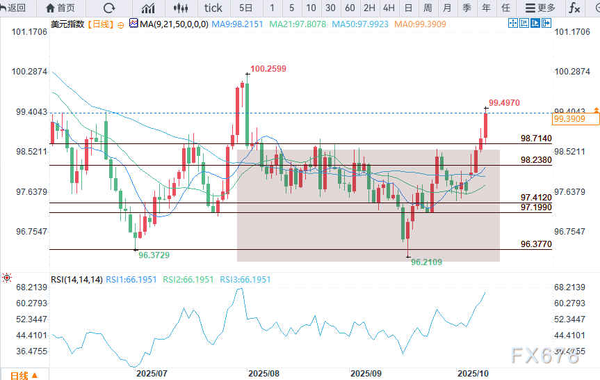 盈凯外汇官网报道——周四(10月9日)美盘时段,美元指数盘中上涨0.54%,报99.377,创下自8月1日以来的最高水平,美元全面走强。