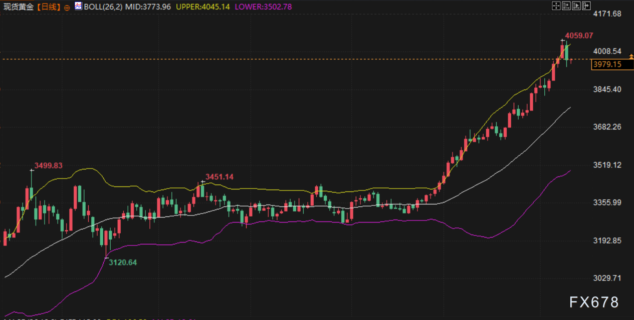 金价周三首次突破每盎司4000美元,达到4059.05美元的历史新高。在地缘政治和经济不确定的情况下,这种非孳息资产传统上被认为是一种对冲工具,金价今年已经上涨了约 52%。