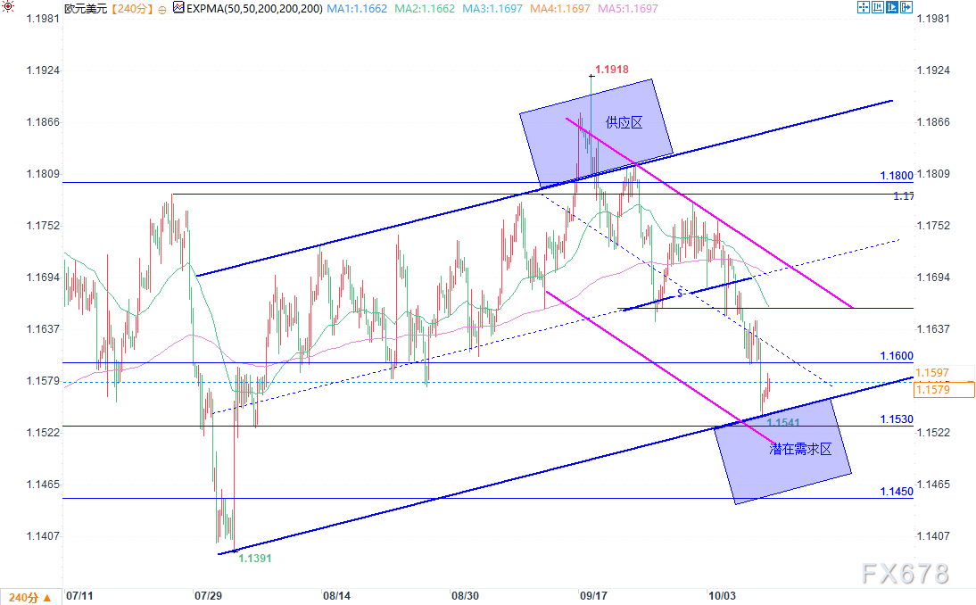 从空头视角来看,当前市场正处于一个下降通道内;该通道的中位线与此前1.1600的局部支撑位,均可能构成阻力。