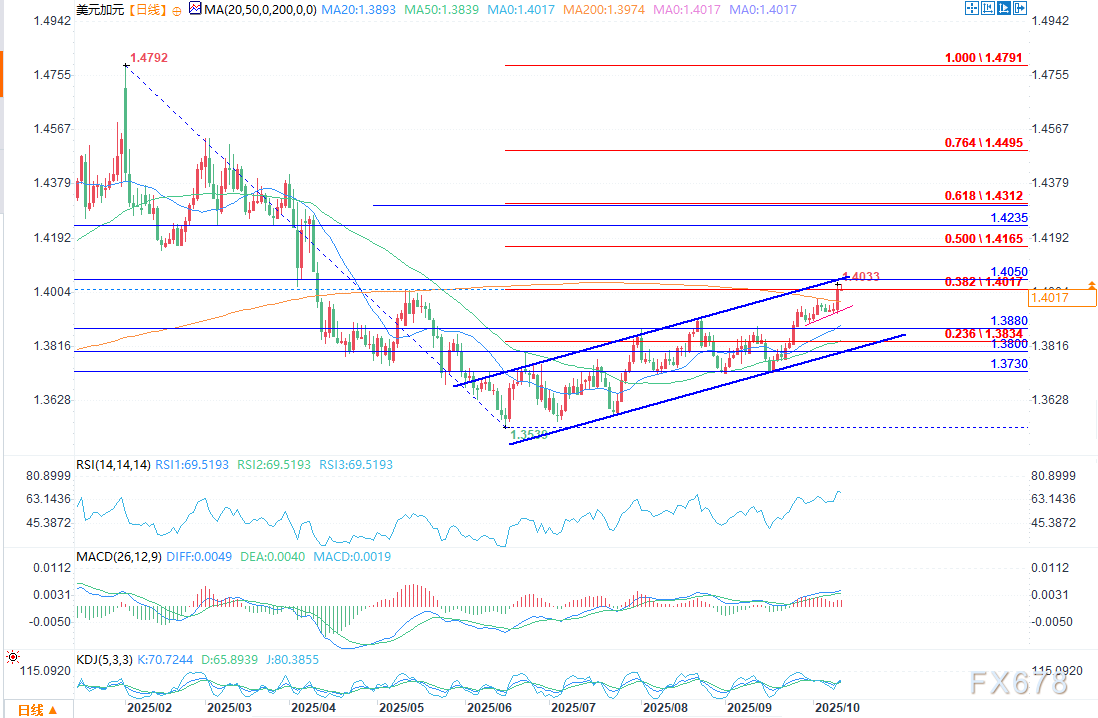 不过,当前需保持一定谨慎。原因在于,价格正处于1-6月下跌区间的38.2%斐波那契回撤位附近,该位置此前曾在5月限制涨势,使汇率受阻于1.4017附近。同时,上行通道上轨也处于相近区间。叠加日线图相对强弱指数(RSI)徘徊在70超买水平附近,回调风险有所上升。