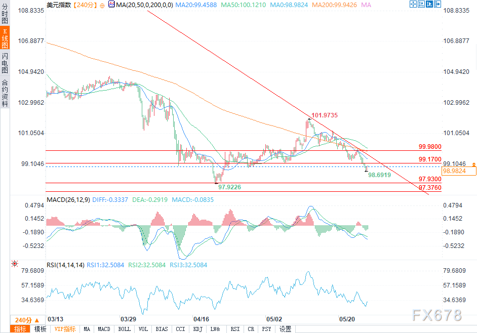 嘉盛外汇官网报道——周一(5月26日)欧盘时段,美元指数(DXY)盘中维持跌势,交投于98.99附近,财政担忧和信用评级下调打压市场情绪。由于美国今日因阵亡将士纪念日假期休市,交易量清淡。