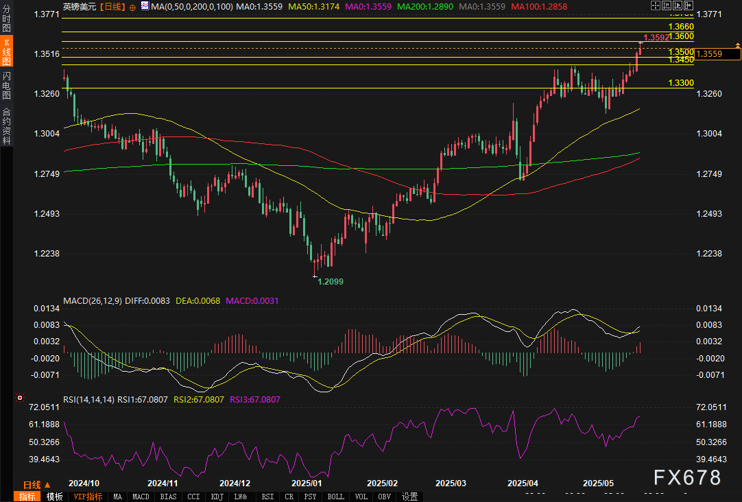 机构分析师对后市看法存在分歧。OCBC外汇分析师指出,英镑的强势表现得益于英国经济数据超预期和美英贸易协定的达成,技术面动能依然强劲,上看1.3660和1.3750。但UOB集团分析师则认为,尽管中长期趋势仍偏多,但短期超买信号明显,1.3600关口可能难以有效突破。