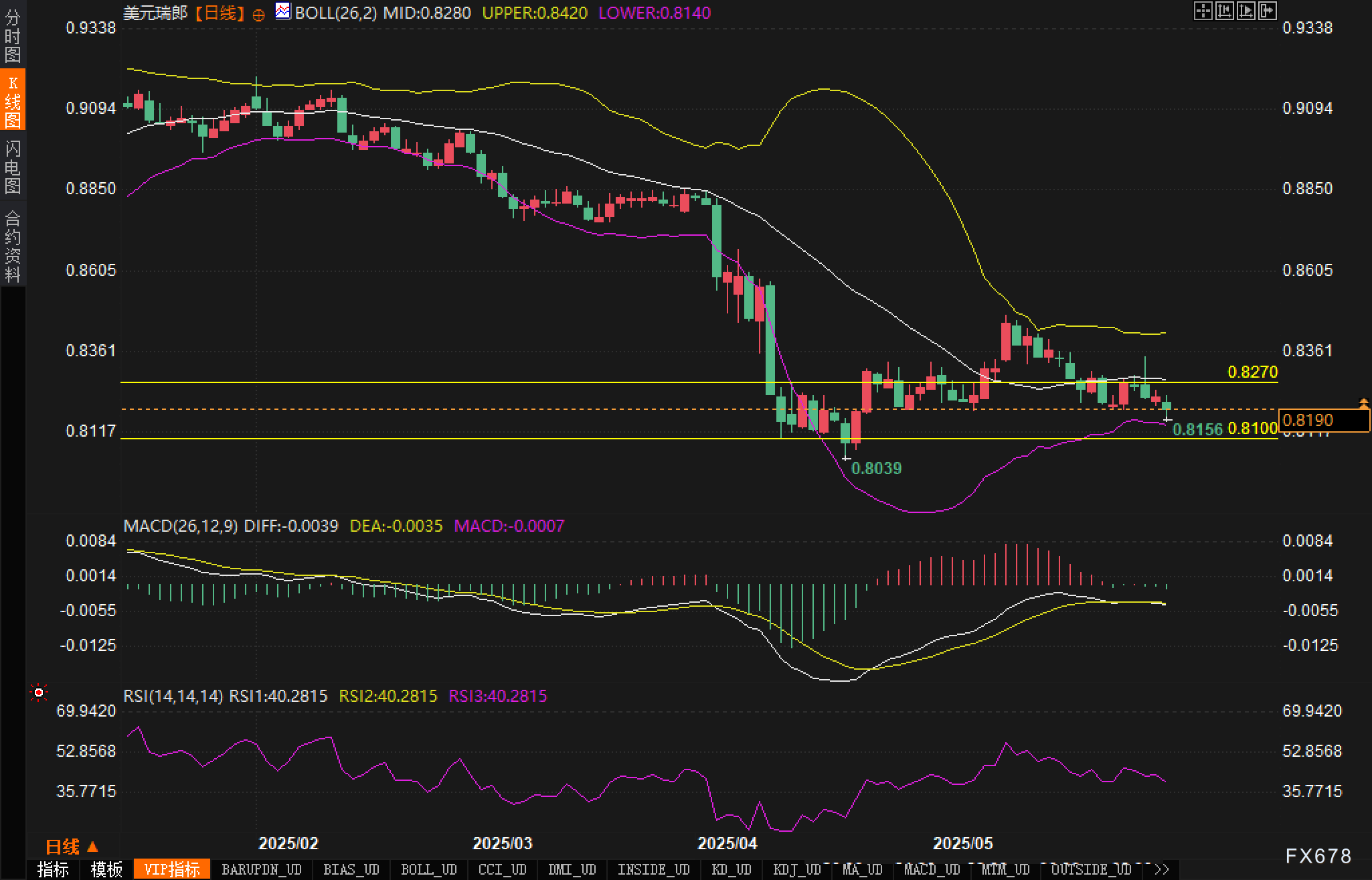 短期展望:若美国经济数据疲软或美联储官员发表鸽派言论,汇价可能进一步下探0.8100支撑。反之,若数据强劲提振美元,汇价有望反弹测试0.8270阻力。