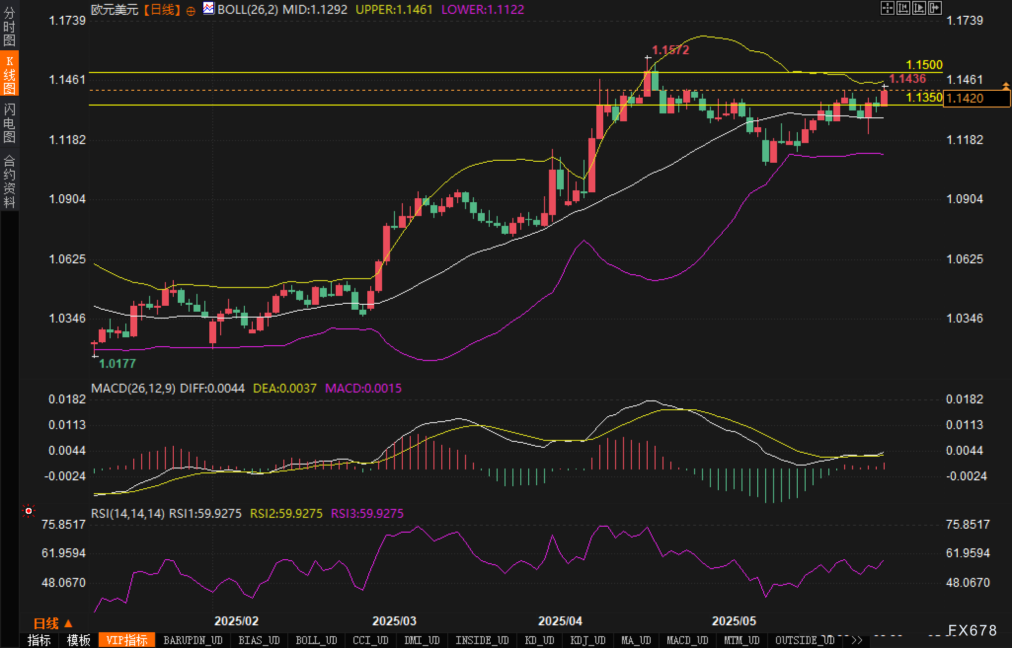 RSI指标方面,14日RSI读数为59.9275,处于中性偏强区域,既未进入超买区域,也远离超卖水平,表明汇价仍有进一步上行空间。