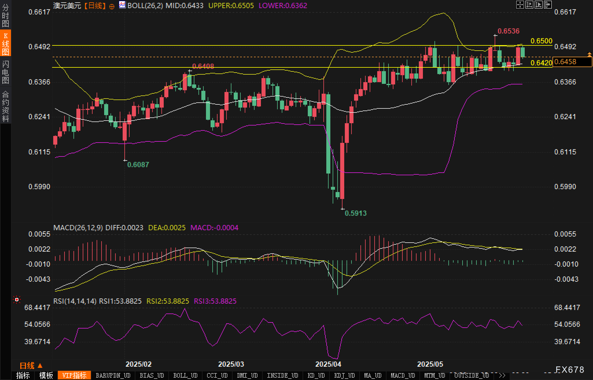 当前市场情绪整体偏谨慎。澳洲本地数据前景不佳,而海外主要风险事件未见明朗,导致多头缺乏上攻动能。尽管部分交易员试图捕捉0.6500突破机会,但技术性抛压随即出现,显示上方压力犹在。