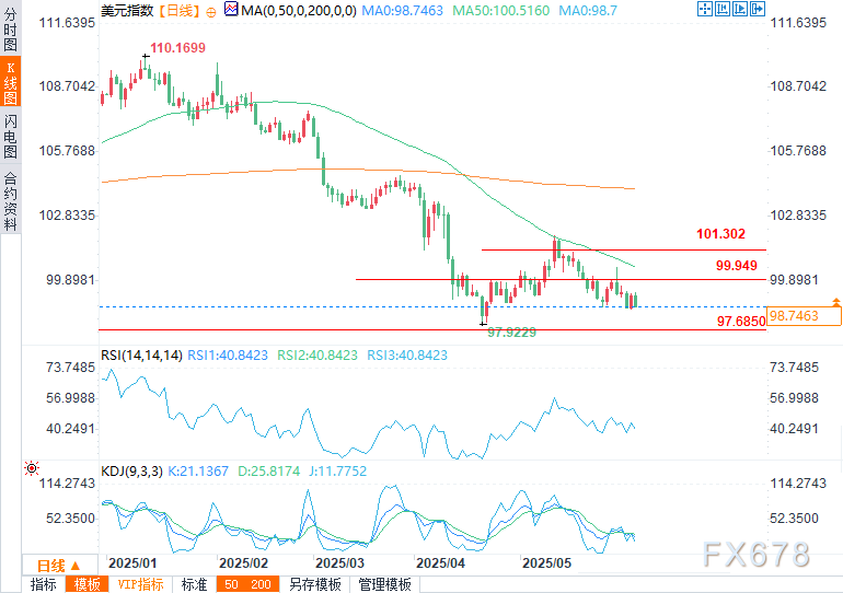盈凯外汇官网报道——周三(6月4日)美国时段,受令人失望的劳动力和服务业数据、美联储面临的新一轮政治压力以及不断升级的贸易紧张局势推动,美元指数(DXY)下滑。尽管该指数仍在周二的区间内,但技术前景已变得脆弱,明显偏向看跌。