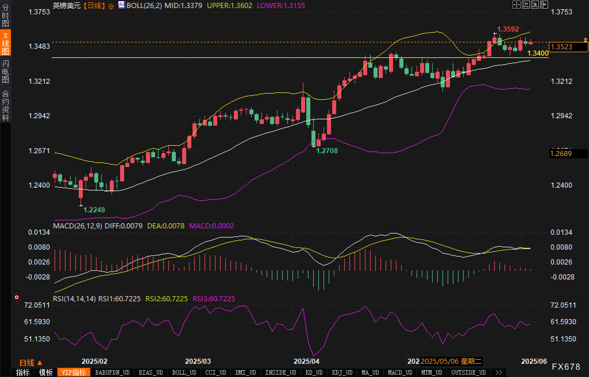 总体来看,技术面维持多头格局,短期或继续在1.3400至1.3600区间震荡整理,上方关键阻力位于1.3592,若有效突破则可能测试1.3750区域;下方支撑关注1.3400整数位,若跌破则可能下探至布林带中轨一线。