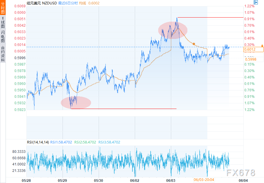 盈凯外汇官网报道——周三(6月4日)欧盘时段,纽元/美元分时图上价格有明显波动,呈现多波上涨与回调。均线在 0.6011 附近,相对平稳。