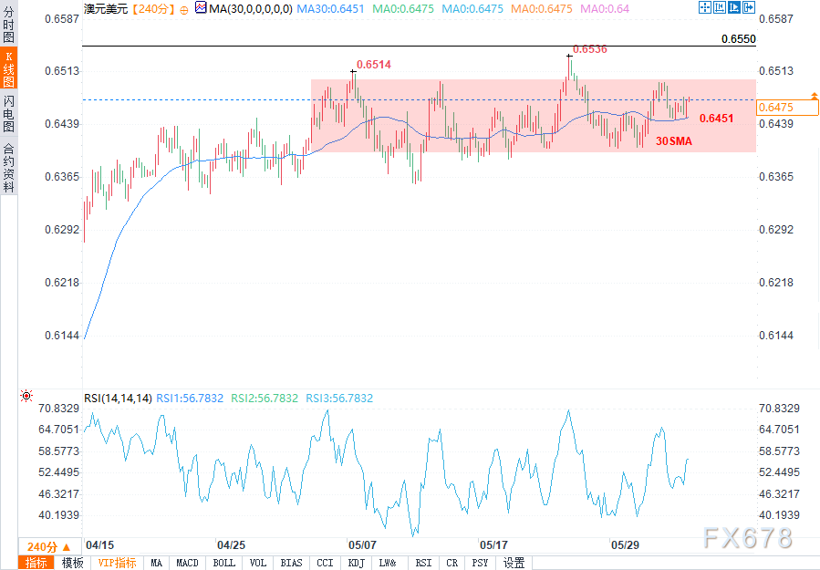盈凯外汇官网报道——周三(6月4日)欧盘时段,分时图上,澳元/美元价格围绕均线(0.6463)波动,有明显的上下震荡,短期多空博弈较激烈,价格在一定区间内反复争夺。当前澳元相对美元偏强,但未进入超买区域。
