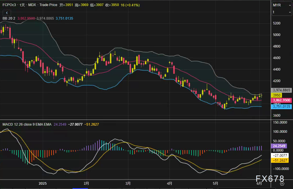 盈凯外汇官网报道——周三(6月4日),马来西亚衍生品交易所(BMD)棕榈油期货周三盘中探底回升,主力合约FCPOc3最终收报3950林吉特/吨,较前日上涨16林吉特(0.41%)。技术面显示,日线布林通道中轨位于3863林吉特,MACD柱状线虽仍处于负值区间(-51.26),但快慢线收敛迹象明显,短期市场或进入多空博弈阶段。