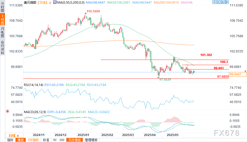 盈凯外汇官网报道——周一(6月9日),美元指数(DXY)小幅下跌,从周五的反弹高点回落,但仍高于98.351和97.921关键技术支撑位。这一温和下跌反映出美元动能的暂时休整,市场在中美贸易谈判于伦敦开启前转为谨慎。