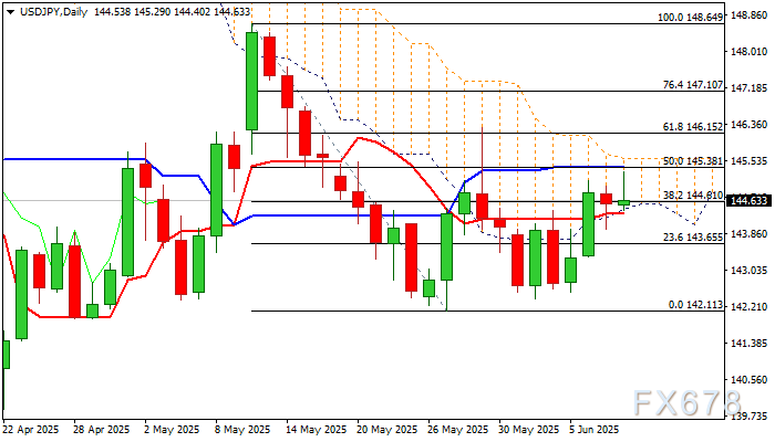 若价格持续跌破云区底部/日线Tenkan线,短期结构将走弱,加速下跌时可能测试143.65/00及142.40支撑位。反之,若有效突破云区顶部将生成看涨信号,目标指向146.15/38(148.64/142.11区间斐波那契61.8%回撤位/5月29日冲高高点)。