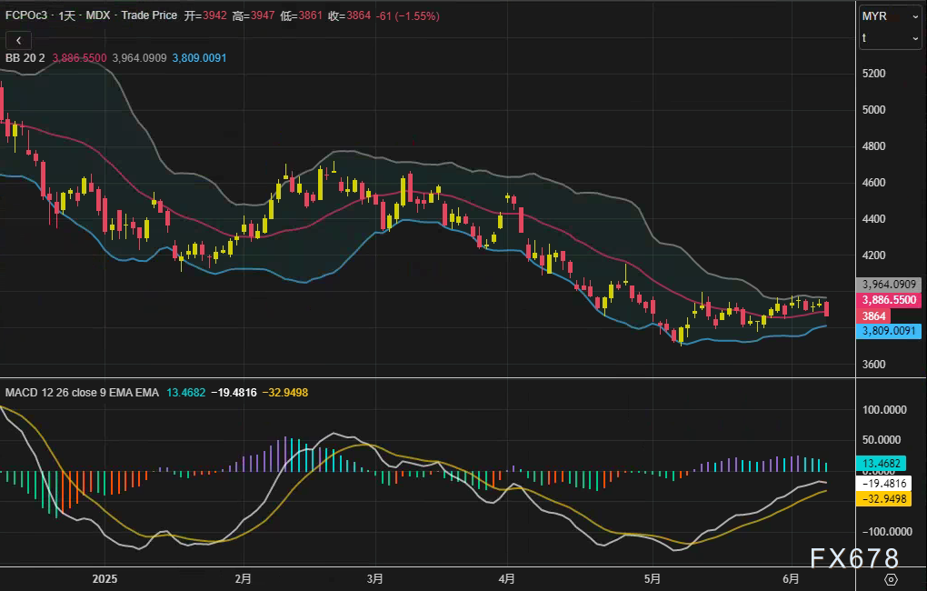 盈凯外汇官网报道——周二(6月10日),马来西亚衍生品交易所(BMD)棕榈油主力合约FCPOc3收于3864林吉特/吨,日内下跌61林吉特(1.55%),终结此前两日连涨。技术面显示,布林带中轨位于3964林吉特,MACD柱状图延续负值,短期动能偏弱。尽管价格承压,但盘中受6月出口数据提振,跌幅较午盘收窄。