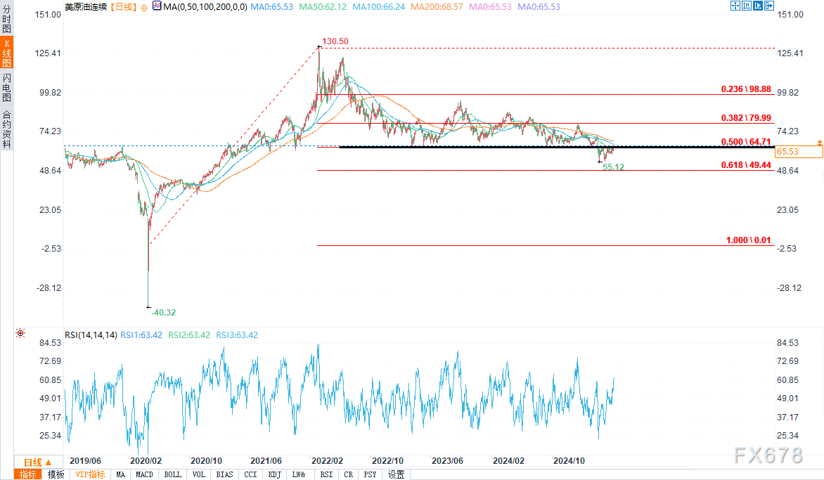 从日线图来看,最近的走势在技术层面具有重要意义。价格回升至2020年低点至2022年高点涨幅的50%回撤位上方,该水平位于64.71美元。尽管自2021年以来的大部分价格走势均维持在该中点上方,但原油价格从4月至今一直持续收于该水平下方,直至被突破。收复这一水平强化了短期看涨的理由。