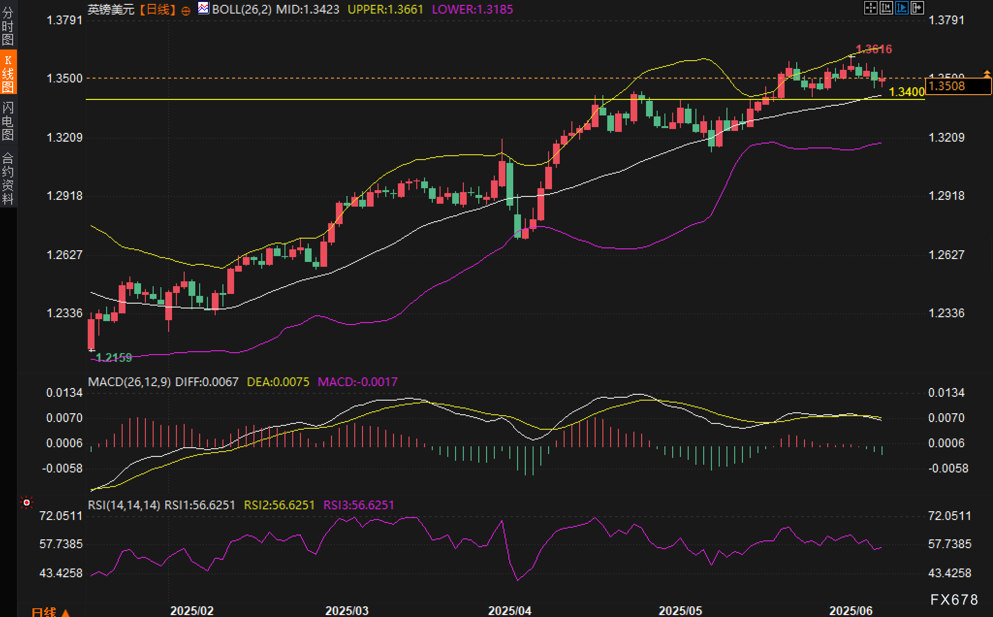 从日线图来看,汇价在经历4月末至5月初的连续拉升后,一度于6月初上探至1.3616高点,随后陷入回调。当前汇价运行于布林带中轨附近,布林带整体呈收口状态,预示行情正处于整理阶段。