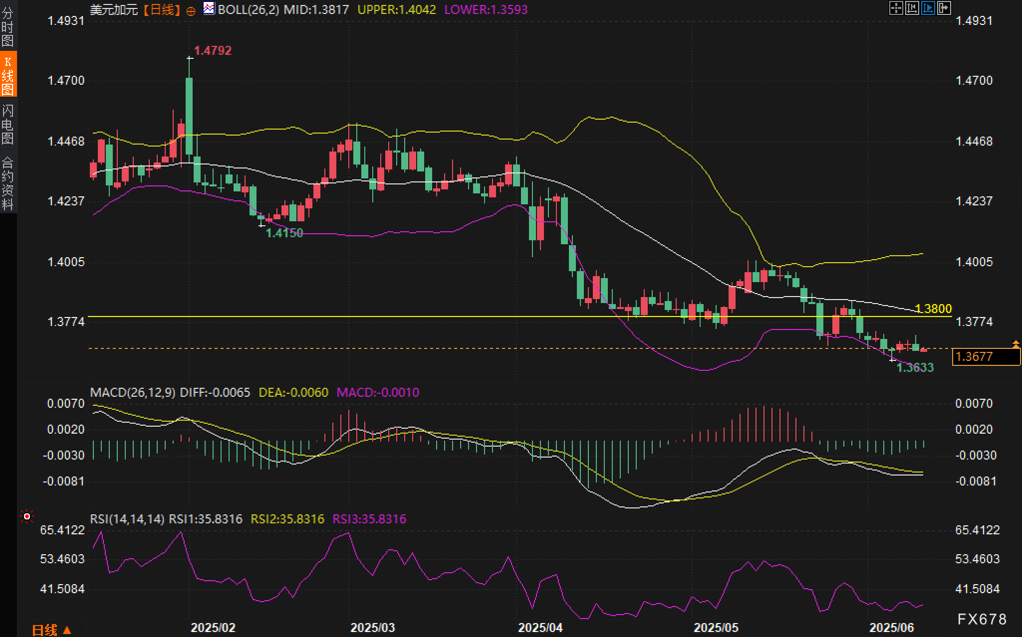 盈凯外汇官网报道——受益于原油价格走强与全球贸易环境缓和,加元近期获得一定支撑;但美元自身亦受避险资金流入提振,令美元兑加元(USD/CAD)汇价在周三(6月11日)欧洲时段交投于1.3680附近,表现出震荡整理的市场结构。