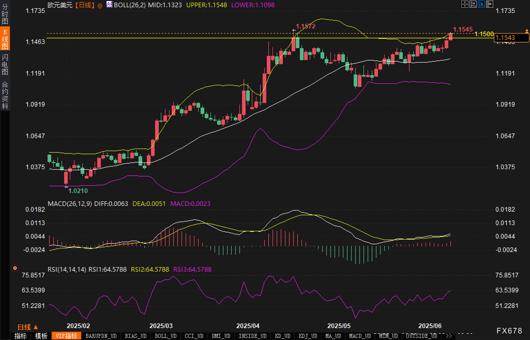 从图表来看,欧元/美元当前价格位于布林带上轨(1.1548)附近,布林带呈现扩张状态,布林带宽度扩大,反映波动率上升,暗示后市可能存在放量突破的可能。