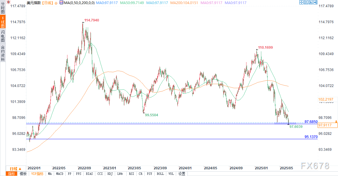 盈凯外汇官网报道——周一(6月16日),美元指数(DXY)跌至97.685,虽较上周创下的多年低点97.621有所反弹,但仍在该水平上方徘徊。交易员正在评估该指数是已触底,还是准备开启新一轮下跌。市场情绪仍偏看跌,空头回补可能限制任何反弹,而新的空头头寸预计将在阻力位附近涌现。