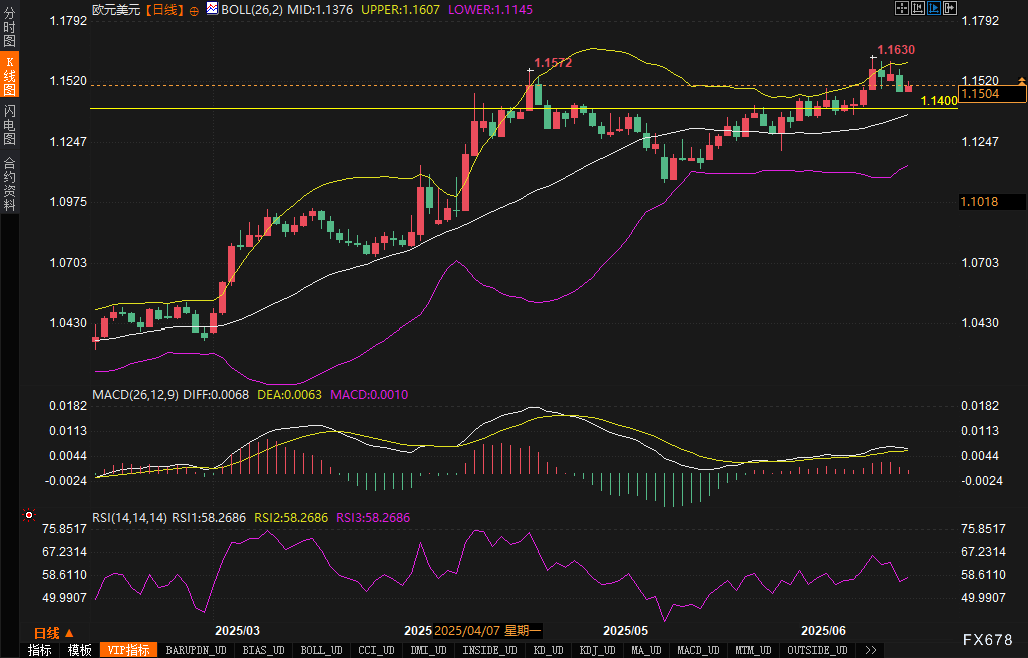 从日线图观察,汇价自5月以来持续震荡走高,但近期在1.1630附近遇阻形成双顶形态。布林带指标显示价格运行于中轨与上轨之间,短期受制于布林上轨(当前约1.1607),上方压力显著。K线组合上,出现多根带长上影线的K线,显示上方抛压沉重,1.1630和1.1572为短线阻力位。下方关键支撑位于1.1400心理关口,若跌破恐引发进一步回撤。