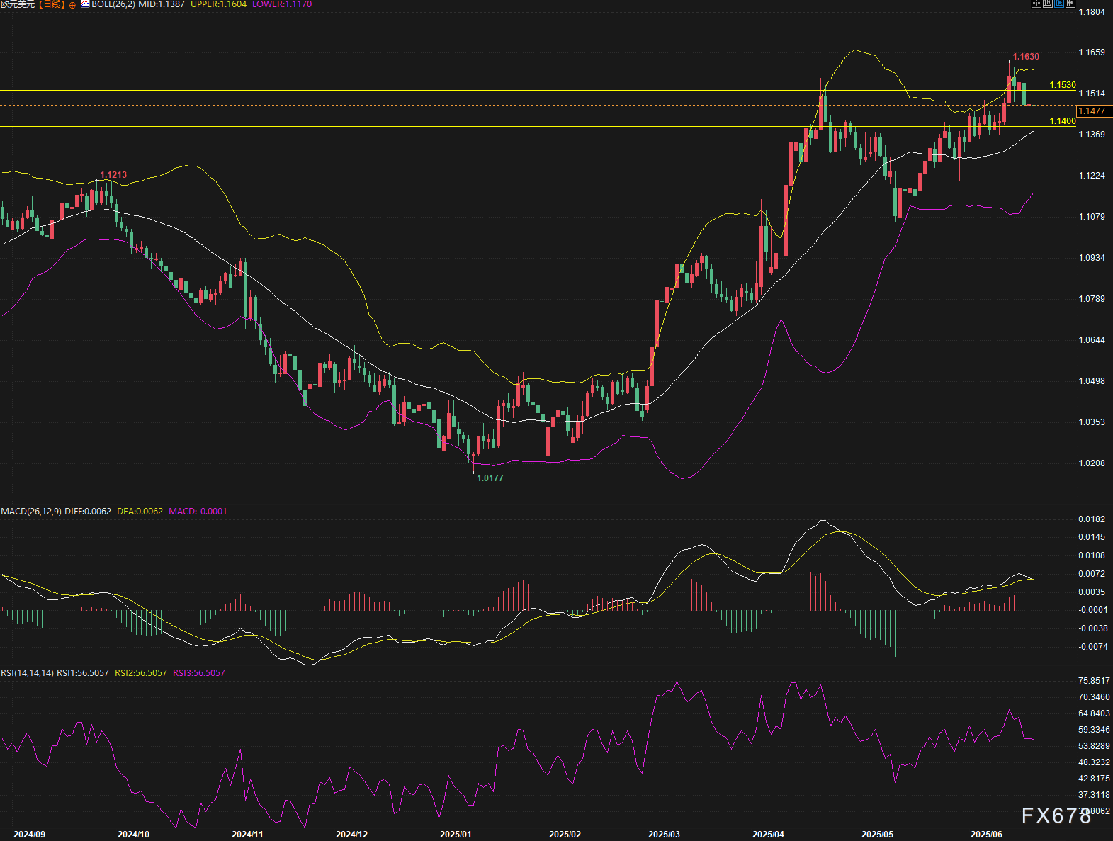 RSI相对强弱指数在56水平,处于中性区域偏上位置,既未进入超买也未触及超卖区间,为汇价后续走势留下充足空间。