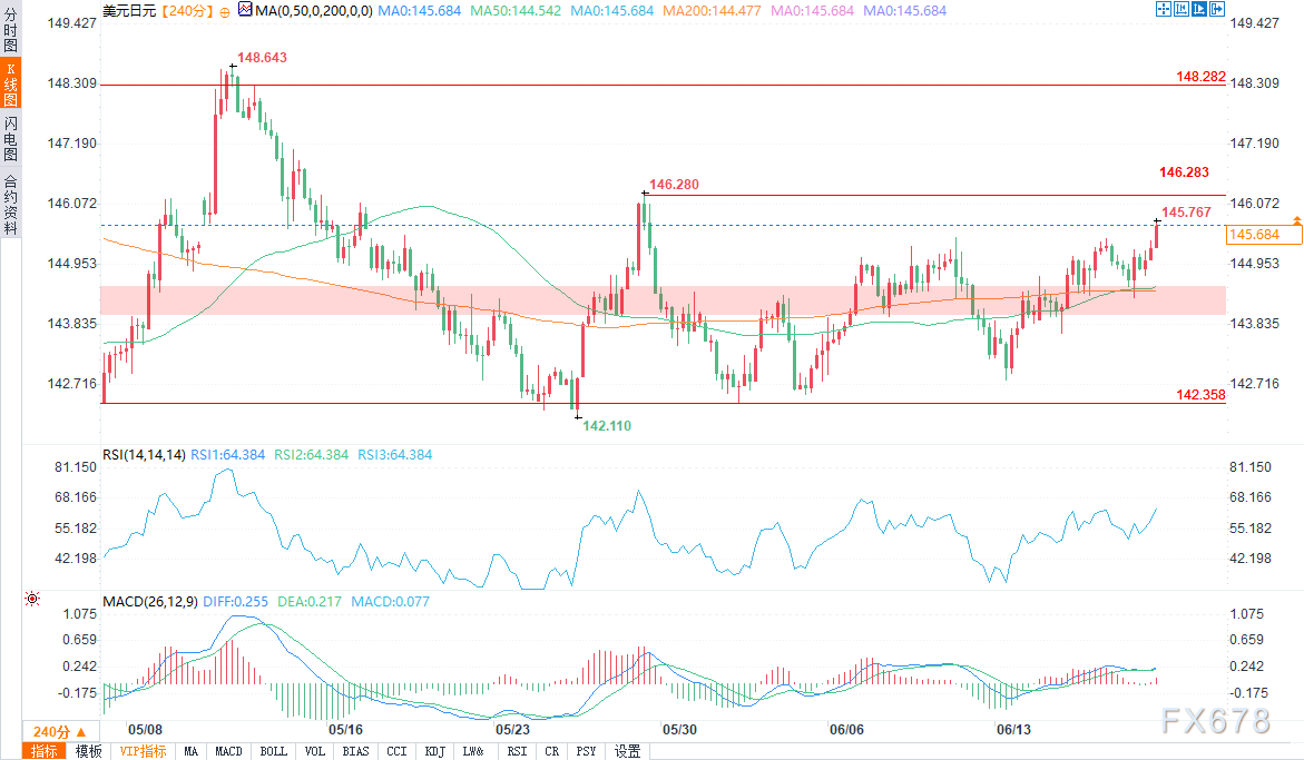 盈凯外汇官网报道——周四(6月19日)欧盘时段,美元/日元盘中交投于145.636/49,涨幅0.36%。地缘政治担忧推动市场,在当前的避险情景下,美元比日元表现更好,美元/日元日内保持走高趋势。