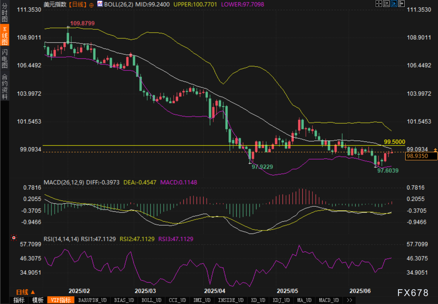 从日线图表观察,美元指数当前运行在99附近,布林带呈现收缩态势,上轨位于100.7701,中轨99,下轨97.7098。价格目前在布林中轨附近运行,显示短期内处于关键技术位置。