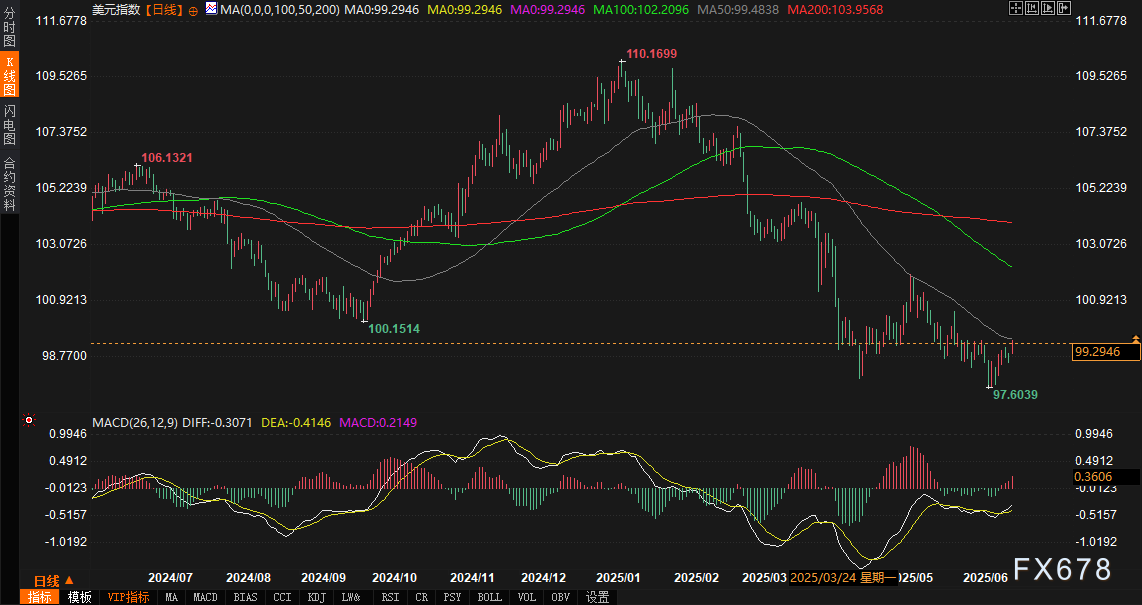 盈凯外汇官网报道——周一(6月23日)美元指数延续反弹。技术面显示,价格仍承压于50日均线(99.5557)下方,但MACD指标自6月18日DIFF上穿DEA线后,短期动能有所改善。市场情绪受双重因素驱动:一方面,美国对伊朗核设施的军事打击引发避险需求;另一方面,美联储官员对7月降息的谨慎表态抑制了美元空头。