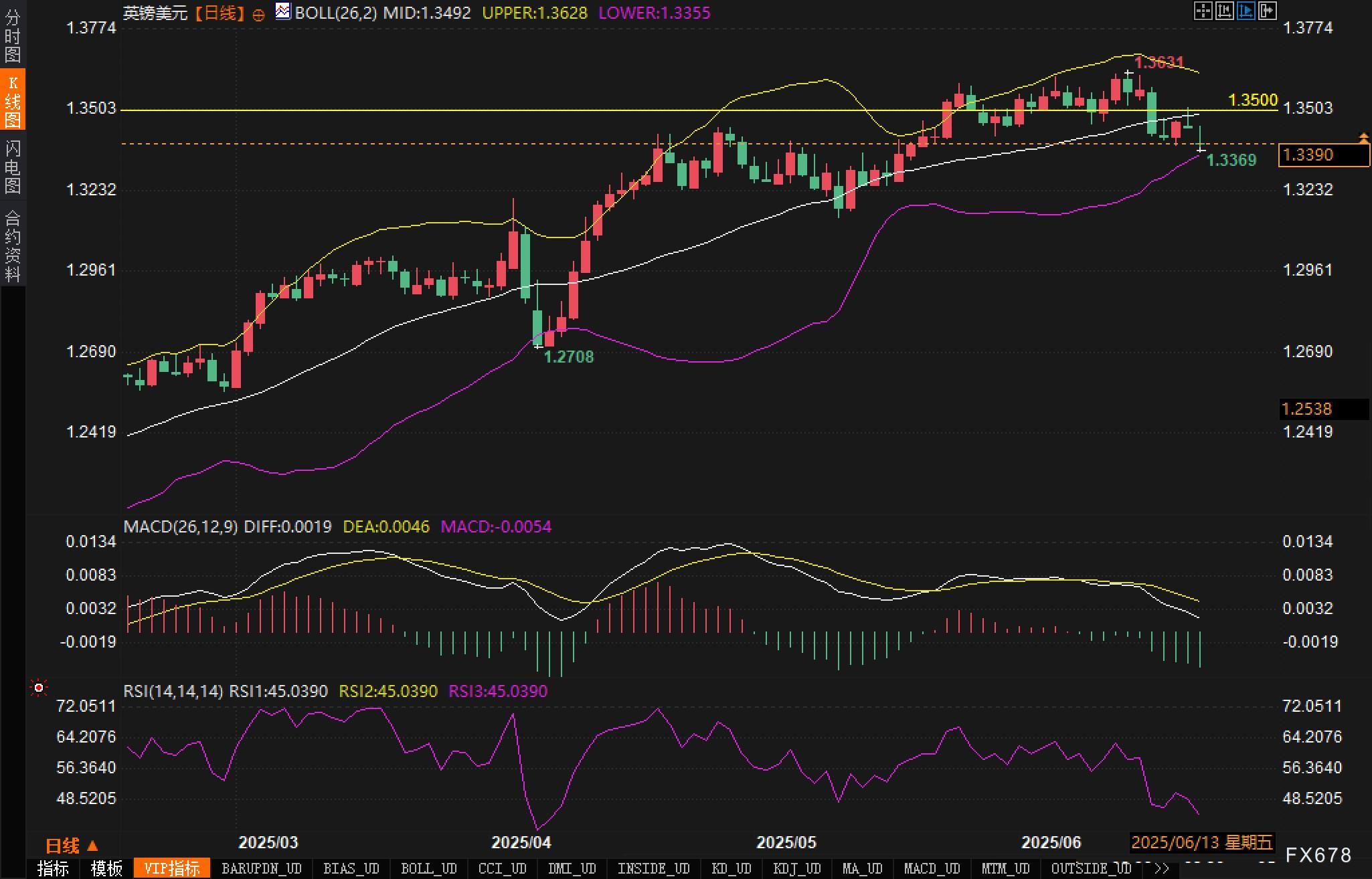 盈凯外汇官网报道——周一(6月23日),英镑兑美元(GBP/USD)日内大幅走低,欧洲交易时段最低触及1.3369,逼近布林带下轨。行情下行的导火索来自地缘局势升级:美国对伊朗三处核设施发动打击,引发中东紧张局势全面升温。避险情绪主导市场,推动美元指数(DXY)刷新三周高点至99.40上方水平,英镑则在避险浪潮中表现疲软,持续承压。