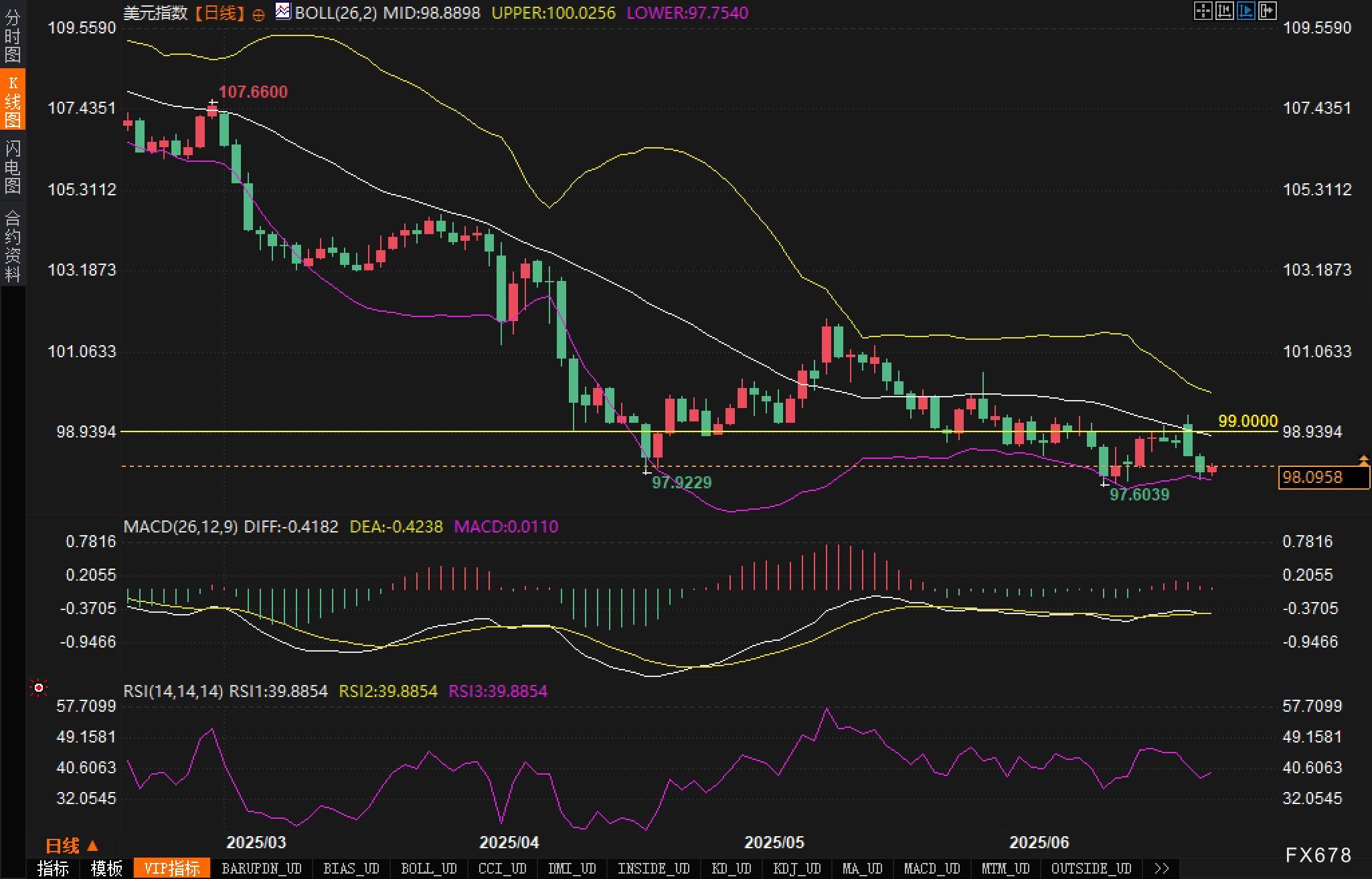 从技术图形来看,美元指数处于明显的下降趋势中,自高点107.66持续下行,目前运行于布林带中轨与下轨之间,处于震荡偏空格局。