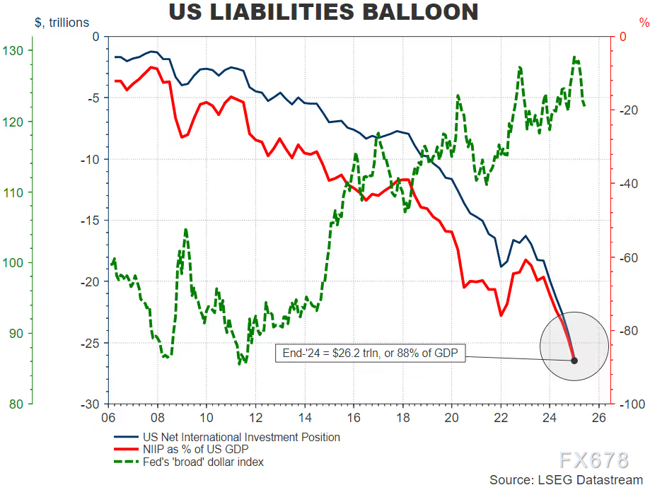 截至2024年底,美国的净国际投资头寸(NIIP)显示,美国对世界其他国家的净负债已高达26万亿美元,相当于GDP的90%。这一数字创下历史纪录,凸显了美国经济对外国资本的高度依赖。然而,这种依赖并非全然利好。外国资本的持续流入推高了美国股市和债市的估值,同时导致美元汇率的持续走强。这种“资本过剩”现象不仅使美国资产价格变得更加昂贵,还可能为未来的市场回调埋下隐患。