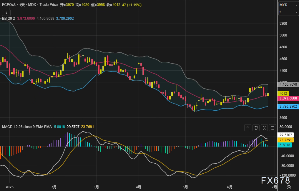 盈凯外汇官网报道——周四(6月26日)马来西亚衍生品交易所9月交割的基准棕榈油合约(FCPOc3)收报4012林吉特/吨,单日涨幅1.19%,但周线终结六连阳录得2.57%回调。值得注意的是,日线布林通道(20,2)中轨3973林吉特构成日内支撑,而MACD柱状体收窄至5.8,显示短期动能有所衰减。适逢马来西亚公共假期休市前,市场正在重新评估供需格局的边际变化。