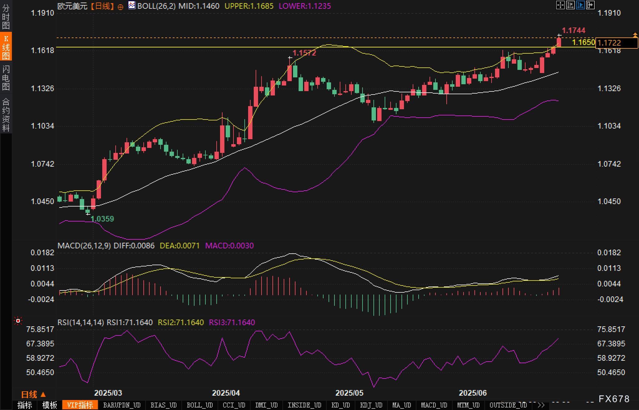 盈凯外汇官网报道——周四(6月26日),欧元兑美元持续第六日上扬,盘中触及1.1744,为2021年9月以来新高;欧洲时段汇价交投于1.172附近。近期美元大幅下挫,主要受到对美联储独立性担忧影响,而欧元受益显著。