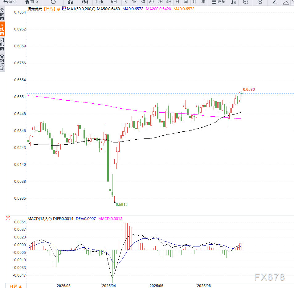 盈凯外汇官网报道——澳元兑美元(AUD/USD)周二回升至0.6560附近,得益于市场风险偏好回暖。此前,美国媒体报道称,特朗普政府正在寻求与主要贸易伙伴达成“阶段性小范围协议”,以避免7月9日自动恢复高关税。