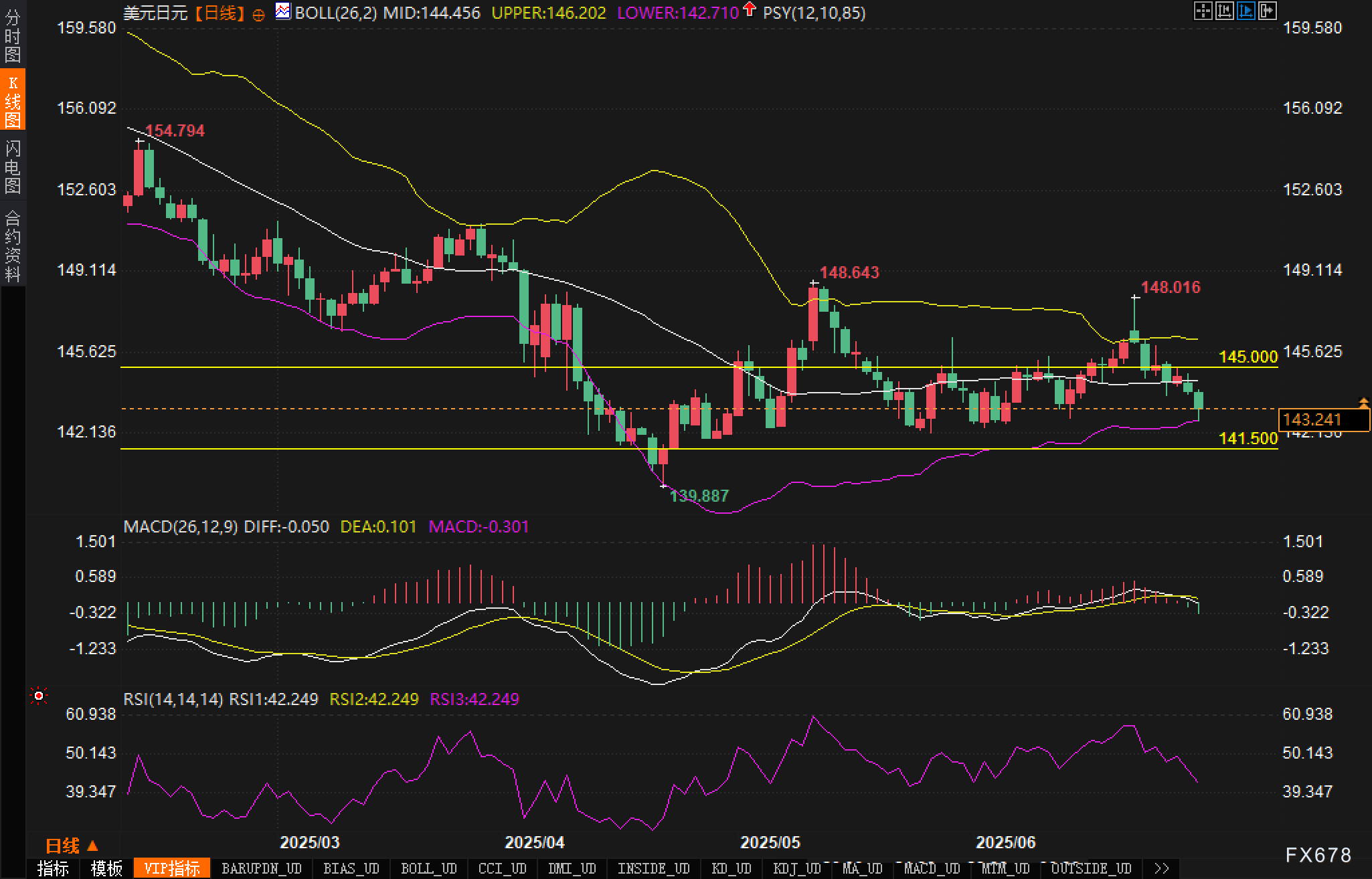从日线图上看,汇价当前处于布林带中轨与下轨之间,正在测试关键支撑带区域。布林下轨位于142.710一线,日内低点靠近该位置。分析认为141.500为核心支撑位,若后续有效跌破该位,则可能打开新一轮下行空间。