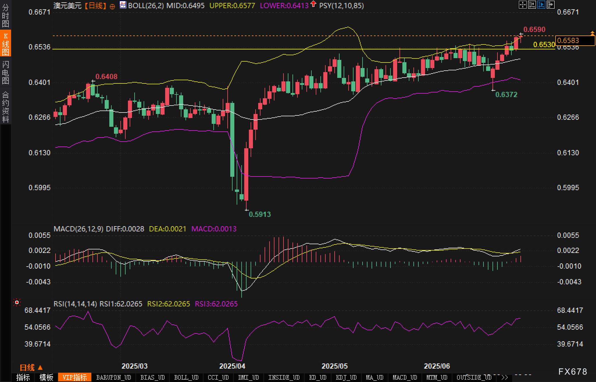 盈凯外汇官网报道——周二(7月1日),澳元兑美元延续上行走势,连续第二个交易日上涨,日内最高触及0.6590,刷新年内新高。受益于美元整体走软、澳洲关键贸易伙伴制造业数据改善,以及澳元本身的技术性突破,汇价稳步攀升。