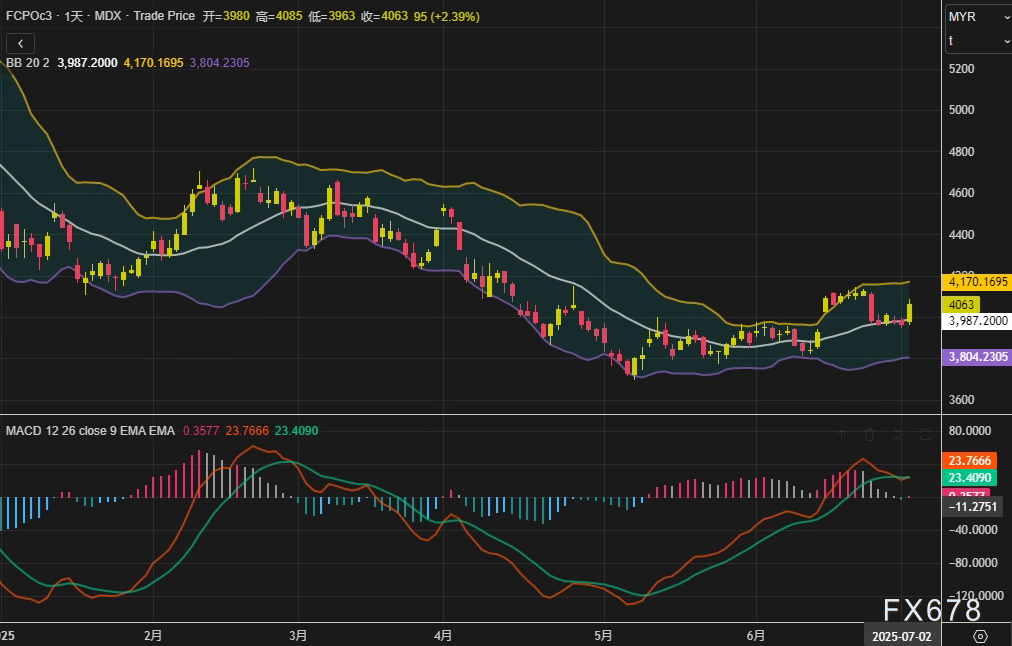 盈凯外汇官网报道——周三(7月2日),马来西亚衍生品交易所(BMD)棕榈油期货结束连续两日跌势,主力9月合约FCPOc3收报4063林吉特/吨,单日涨幅2.39%,创下近一周新高。技术指标显示,价格突破布林带中轨3987林吉特,MACD柱状线收窄至0.3577,短期动能有所修复。