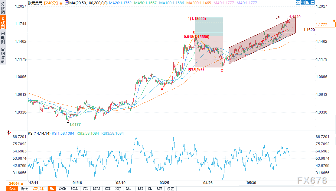 若将4月初的涨势(恰逢特朗普宣布新关税政策)视为初始推动浪A→B,5月低点视为B→C调整浪的终点,那么根据斐波那契扩展理论,该货币对目前已升至1.1850附近的关键阻力区(如图中箭头所示)。
