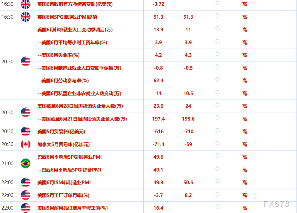 投资者关注周四更全面的非农就业报告,该报告比往常提前一天发布,市场将于7月4日独立日假期休市。路透对经济学家的访查显示,预计美国6月就业增长将放缓,失业率将小幅上升至4.3%。