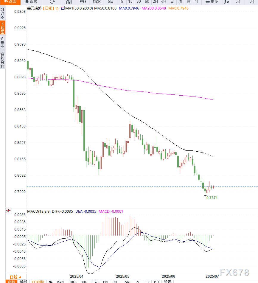 从技术角度来看,USD/CHF维持在0.7940–0.7960区间震荡,短期均线略向下倾斜,MACD指标横盘整理,显示动能不足。若突破0.7975区域,可能测试0.8000整数关口,进一步上行将面临0.8030阻力位。