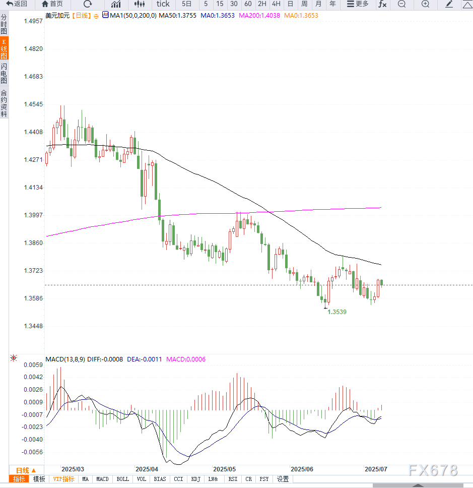 盈凯外汇官网报道——周二亚洲交易时段,美元/加元汇率从前一交易日的逾0.5%涨幅中回落,交投于1.3650附近。美国总统宣布,对14个尚未与美签署贸易协议的国家实施高达40%的新一轮关税,引发市场对全球贸易担忧情绪再起,美元因避险转换需求及财政担忧表现疲弱。