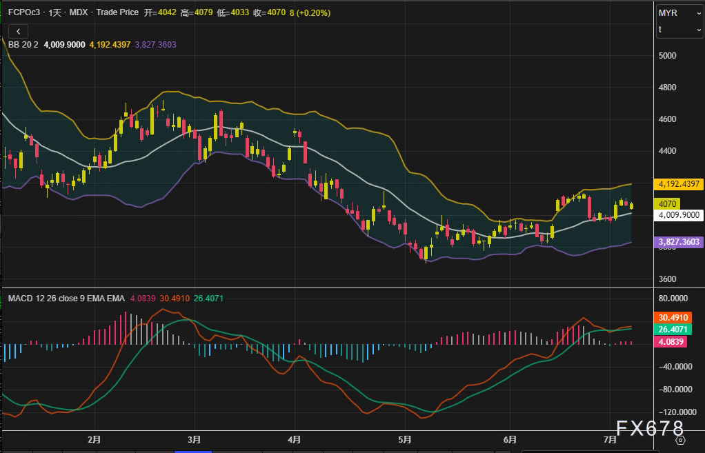盈凯外汇官网报道——马来西亚棕榈油期货周一(7月7日)逆势收涨,尽管亚洲交易时段早盘受豆油拖累一度承压,但原油价格反弹最终带动市场情绪回暖。截至收盘,Bursa Malaysia交易所主力9月合约FCPOc3报4070林吉特/吨,微涨8林吉特(0.2%)。日线图上,布林通道中轨位于4009林吉特,MACD柱状线收窄至4.08,显示短期动能虽有减弱,但价格仍站稳关键支撑上方。