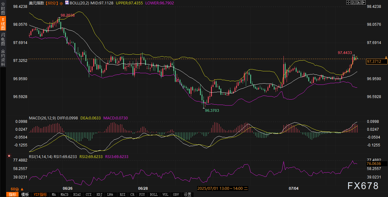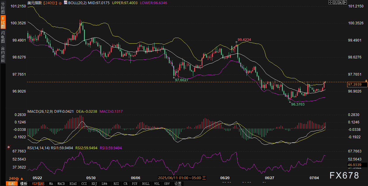 盈凯外汇官网报道——周一(7月7日),全球外汇市场聚焦美元指数动态。截至当日,美元指数报97.3702,日内上涨0.38%,延续了近期多空博弈下的震荡特征。当前市场环境中,美国经济数据的韧性、美联储政策预期的变化,以及外部事件引发的避险情绪波动,共同构成了美元指数走势的核心驱动因素;而60分钟、240分钟级别技术图形的分化表现,则为短期行情推演提供了关键线索。