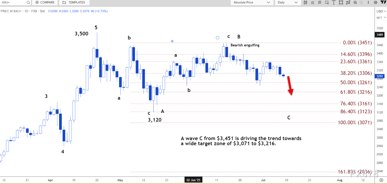 日线图上,自 3451 美元以来的下行趋势依然完好。自 3451 美元开始的 C 浪正推动该趋势向 3071 美元至 3216 美元的宽幅目标区域迈进。