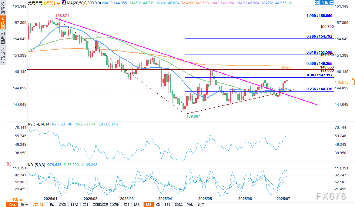 盈凯外汇官网报道——周三(7月9日),美元/日元分时图价格波动较为频繁。价格在日内出现了明显的上升和回落走势 ,最高触及147.178,最低至146.501左右,显示出市场多空双方的博弈较为激烈。