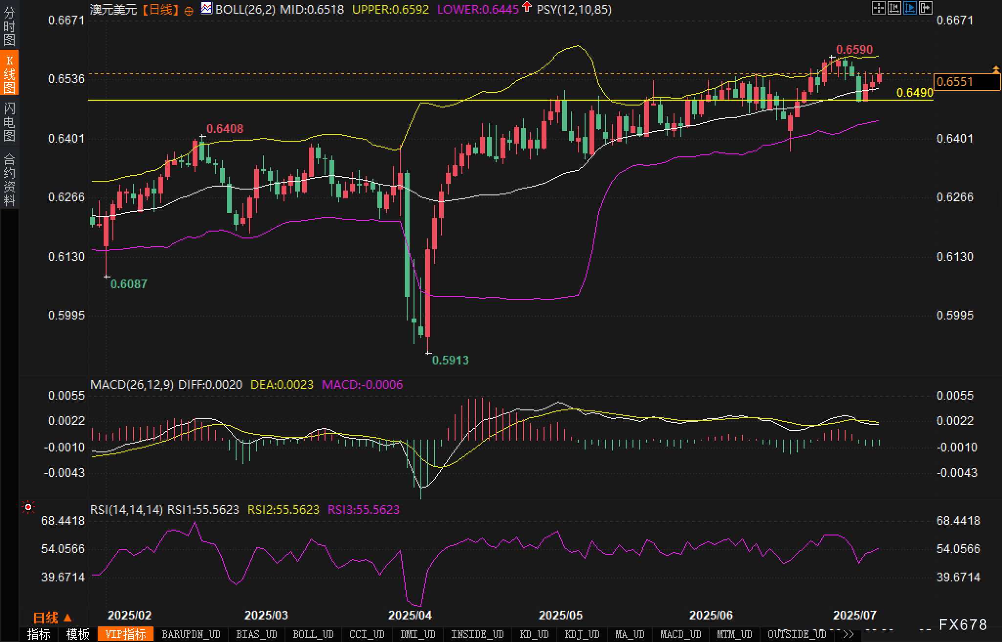 盈凯外汇官网报道——周四(7月10日),澳元兑美元汇价继续维持偏强走势,北美时段交投于0.6550附近,处于近几个月延续的上升区间中。市场正在消化本周内的两大关键事件:一是澳洲联储(RBA)意外维稳利率在3.85%,二是美联储公布的会议纪要暗示短期内不会贸然调整政策。