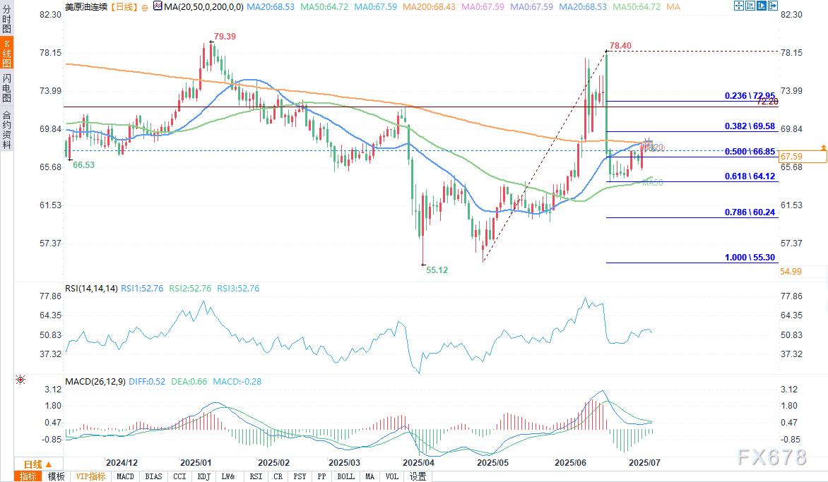 盈凯外汇官网报道——周四(7月10日)欧盘时段,WTI原油期货走跌,盘中报67.72美元每桶,跌幅0.97%,原油价格在日内呈现出较为明显的波动。价格围绕均价线(68.07 美元)上下波动,早盘价格在 68.28 美元附近开始,随后出现一定震荡下行走势,在盘中出现几次反弹尝试,但未能有效突破前期相对高位。市场处于观望状态,等待明确的看涨催化剂以突破当前低迷的交易区间。