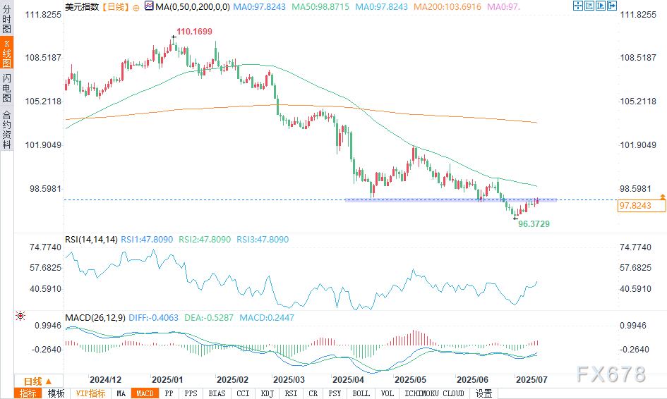 盈凯外汇官网报道——美元指数(DXY)在7月初触及多年低点96.30-96.40区间后迎来反弹,逼近98.00关键关口。尽管技术性买盘和美债收益率的支撑为美元提供了喘息机会,但市场情绪仍受贸易政策主导,特朗普政府重启的高关税举措为美元走势增添不确定性。结合近期经济数据与美联储动态,美元短期内可能延续震荡格局,但长期趋势依然偏空。本文将从贸易政策、货币政策和市场数据三个维度,剖析美元的潜在走势,并展望未来一周的关键催化剂。